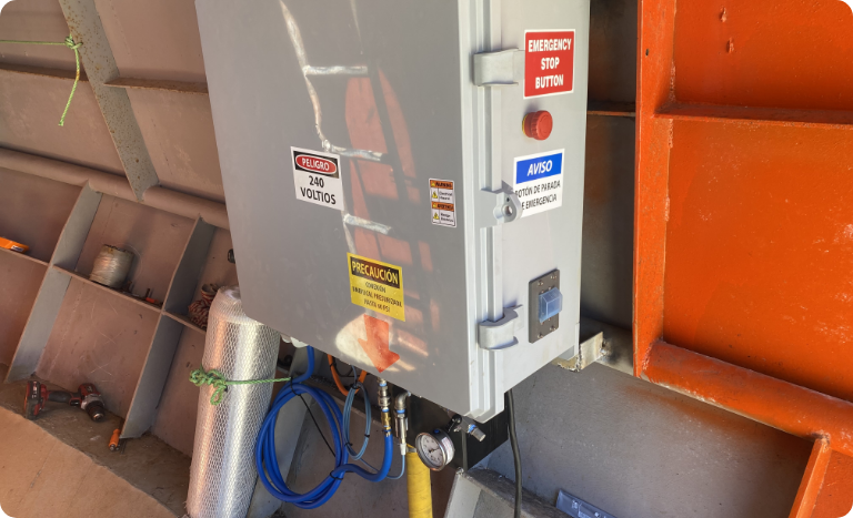 An 11 kW generator supplies AC electric power to the wall-mounted enclosure which powers the PLC controls, remote control, and sends AC power to the head. The remote control can display motor information, depth, direction, and live camera feeds. It also has a tough and durable cable flexible enough for the operator to walk on deck.