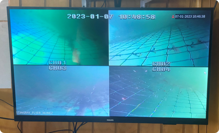 The cleaning head is positively pressurized with dry air. This allows for better hose flotation for travel on the net and most importantly safeguards the electronic components. The umbilical is connected directly to the cleaning head without tension.